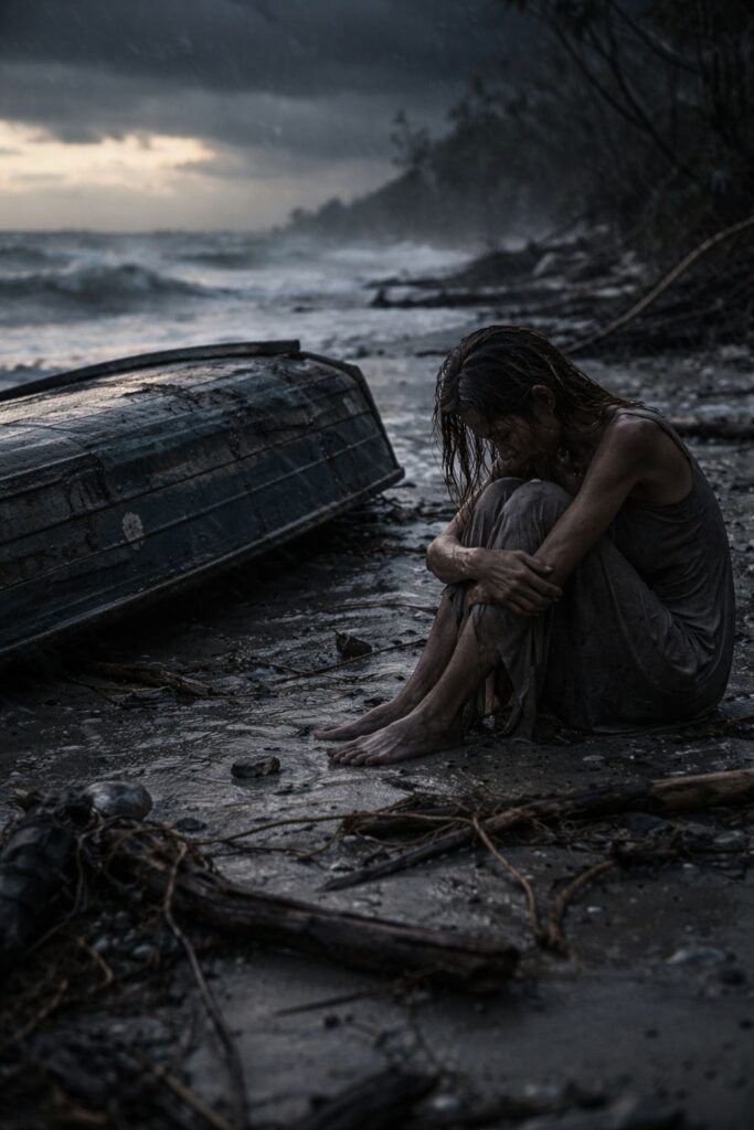 The upturned boat lay beached on the deserted shore, save for an emaciated woman sitting stock-still beside it… At daybreak, a gale broke upon the scene. It viciously unmoored the boat, flinging it into a seething vortex of water, where it thrashed briefly before listing to one side and lurching away beyond sight. The storm …